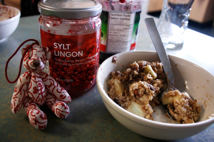 Mr. P enjoying his first Edmontonian breakfast of oatmeal porrige and lingonberry jam, bought from the IKEA store right outside of Edmonton.