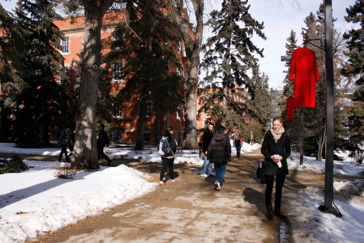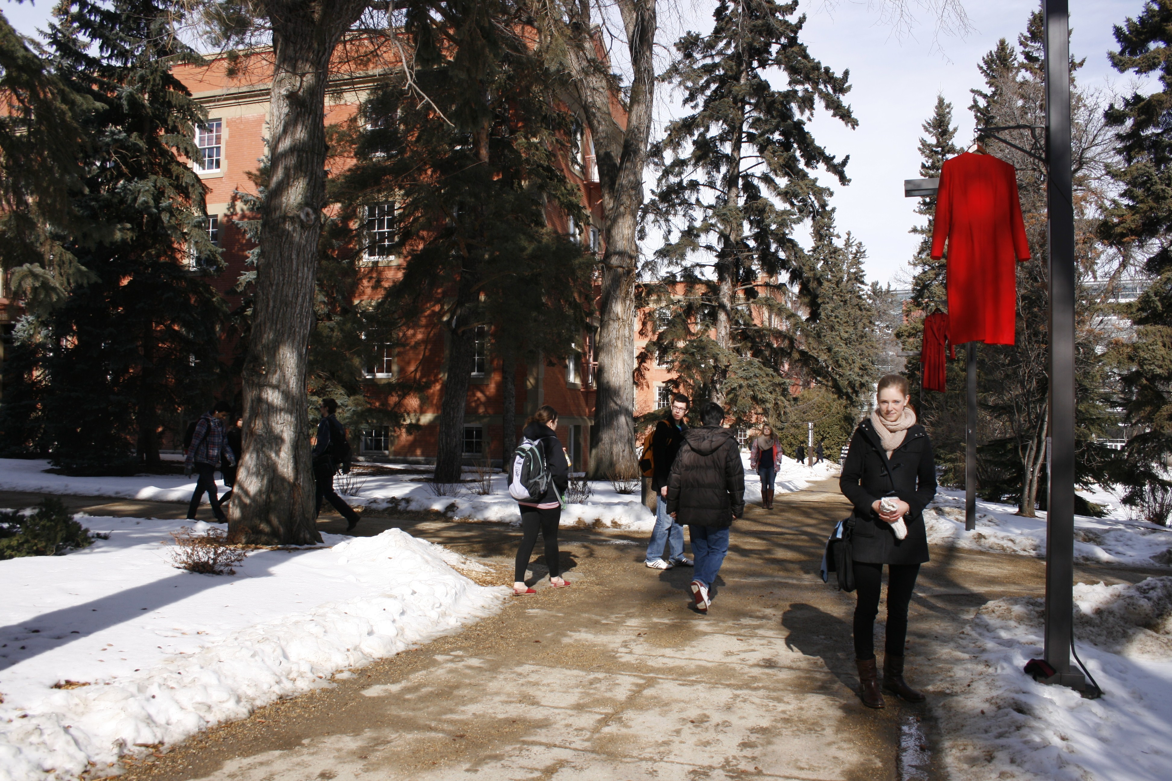 Frida att the University of Alberta campus. The buildings are mostly made of red bricks, which instantly makes me feel at home (seeing as I grew up in Skarpnäck, the red brick suburb of southern Stockholm), but due to the abundance of trees, it’s more or less impossible to get a clear shot of any of them. Annoying for the architecture loving photographer in me, but for the ordinary visitor really adding to the coziness of the place. The red dresses are part of an art project trying to increase the awareness of the abuse of women in the aboriginal community in Alberta.