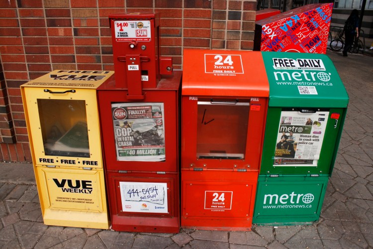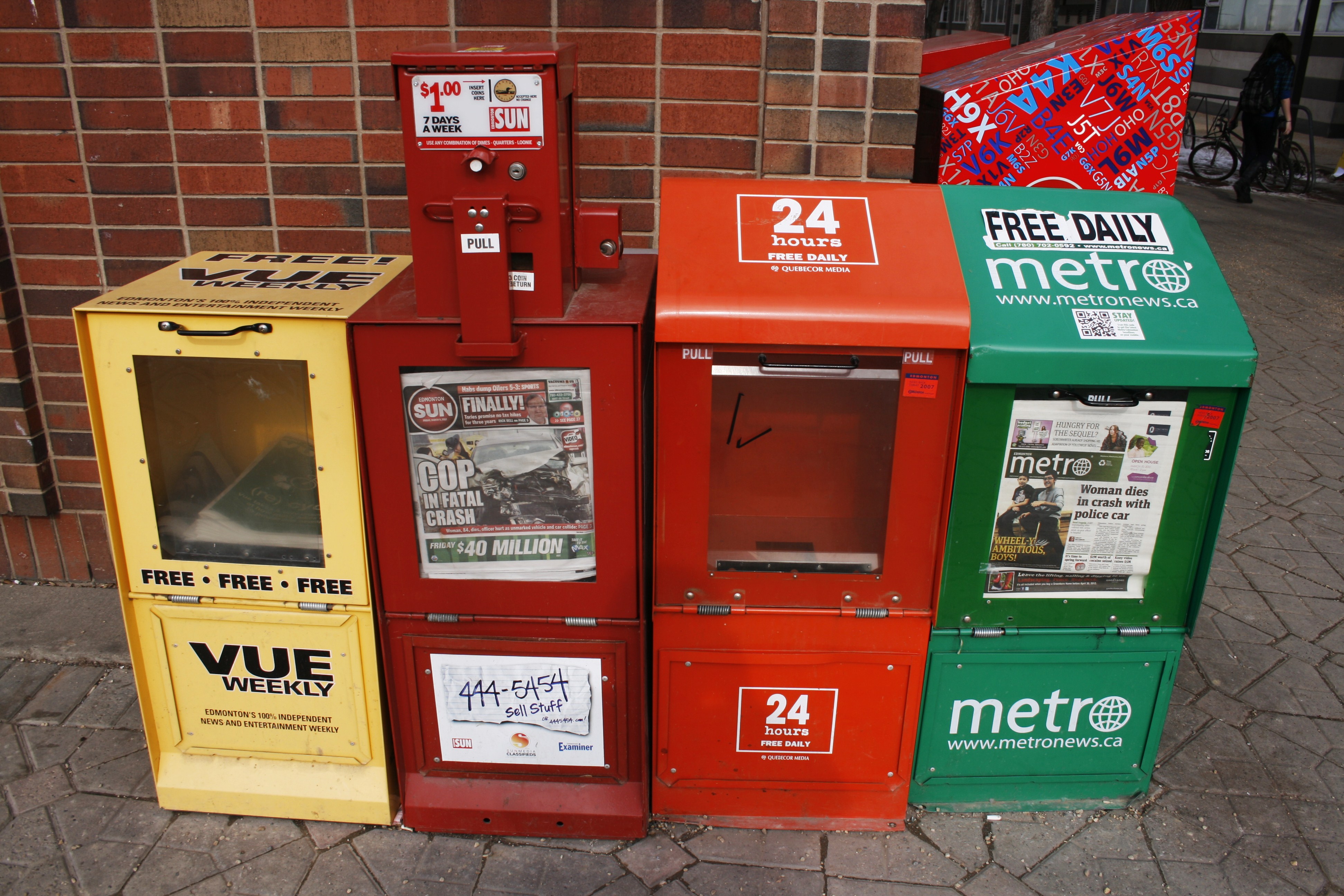 By the university metro station, they provide these four free newspapers. One of them is Metro, our Swedish media export.
