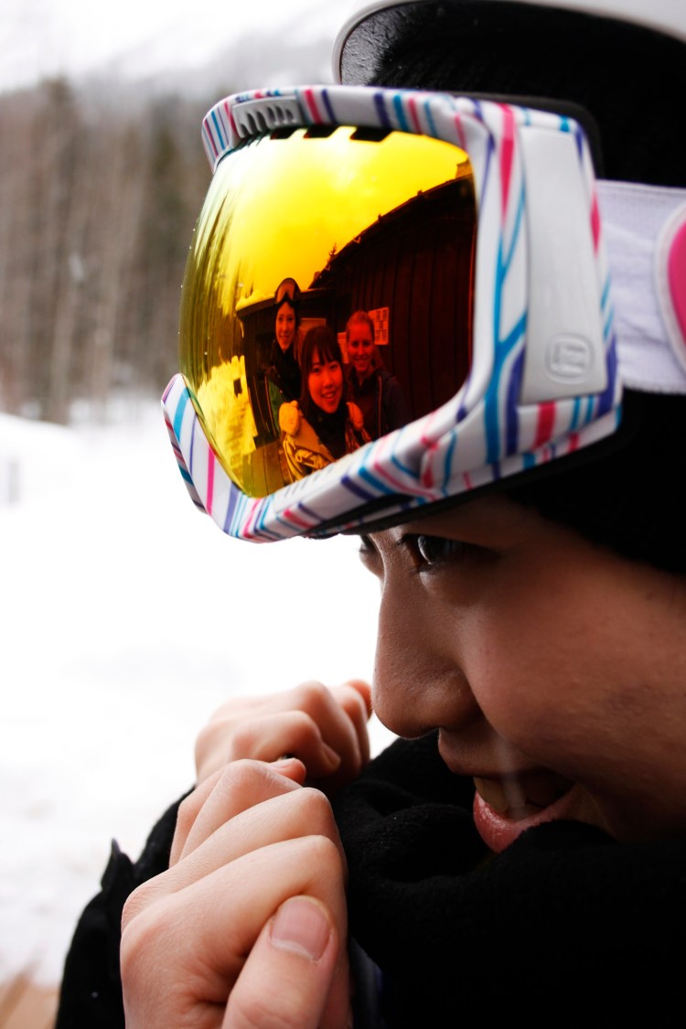 Yea-na in her cool snowboarding goggles, smiling at Frida, Kate and Marit.