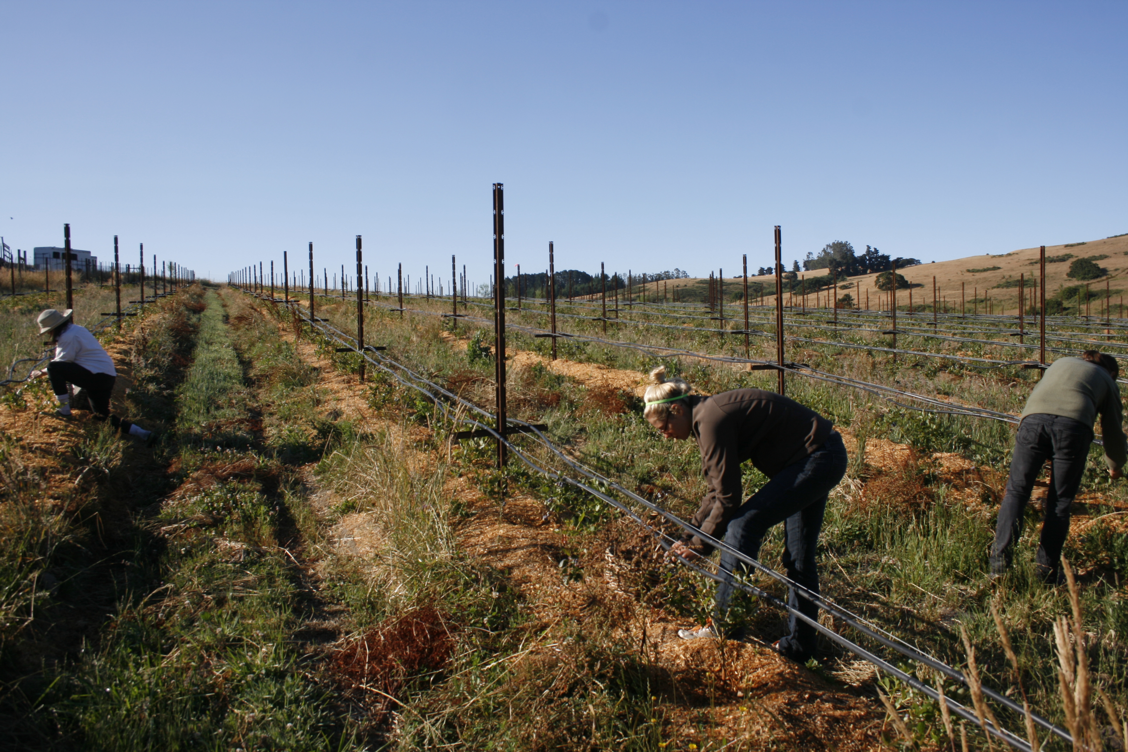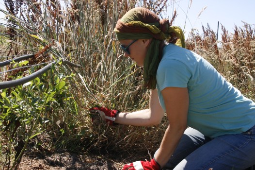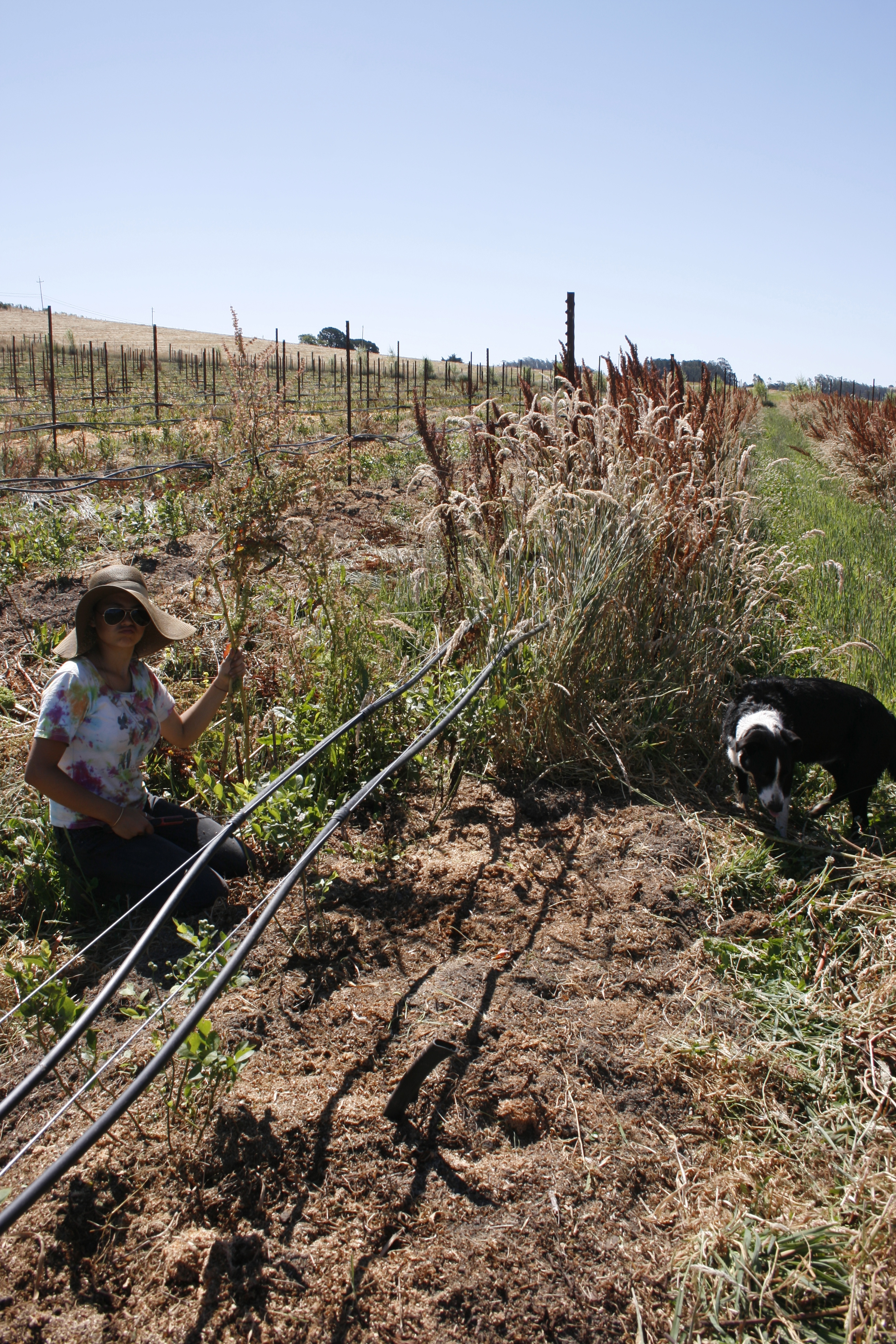 Most days in the field, we weeded. Lorri said that she had been told that she wouldn’t be able to grow organic blueberries for the first five years, because the weeds would kill her. And looking at those thick tufts of grass and thistles, it wasn’t hard to imagine how a less determined farmer than Lorri might yield to the powers of pesticides. But not her. Instead, she invented new ways of weeding. So, with huge pruning knives, we ruthlessly cut everything down. Here my fellow wwoofer Tallulah sits with the crazy-ass-grass that grew so thick and made us all sticky and itchy, together with Troubles, always around to help when one of the mouselike gophers put out is ugly head from its hole in the ground.