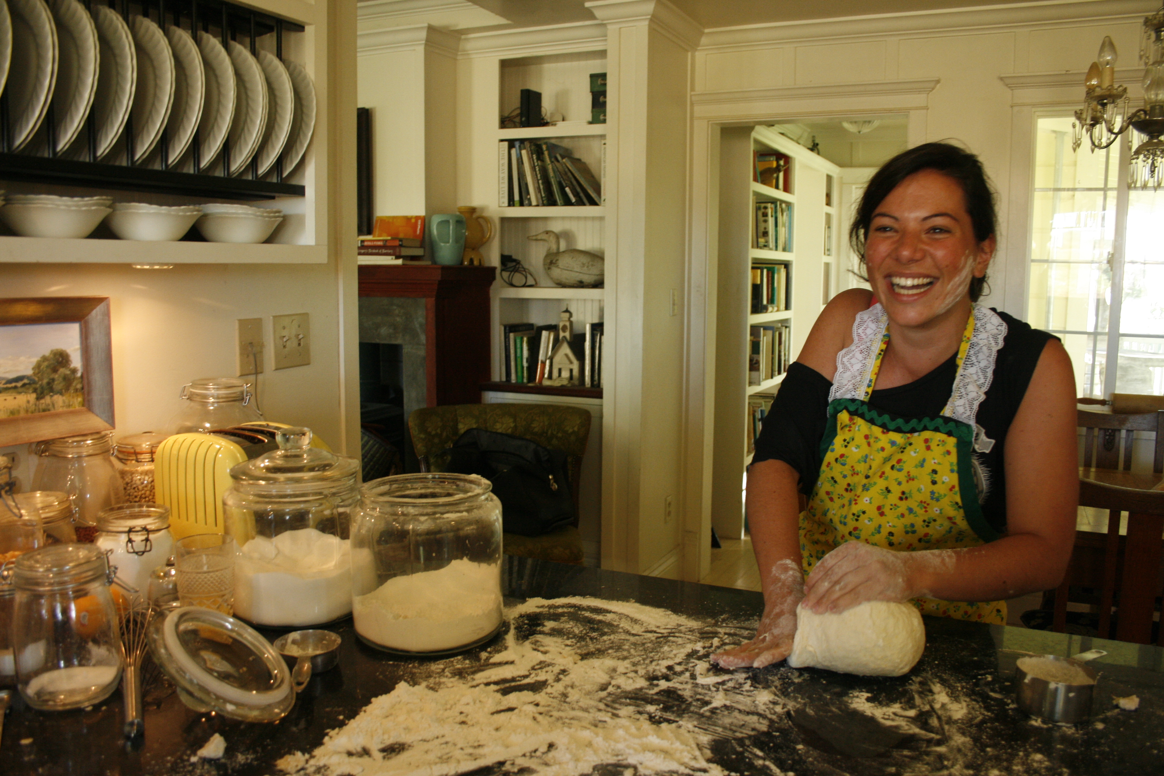 Sandra with flour all over her face – she took her kneading seriously.