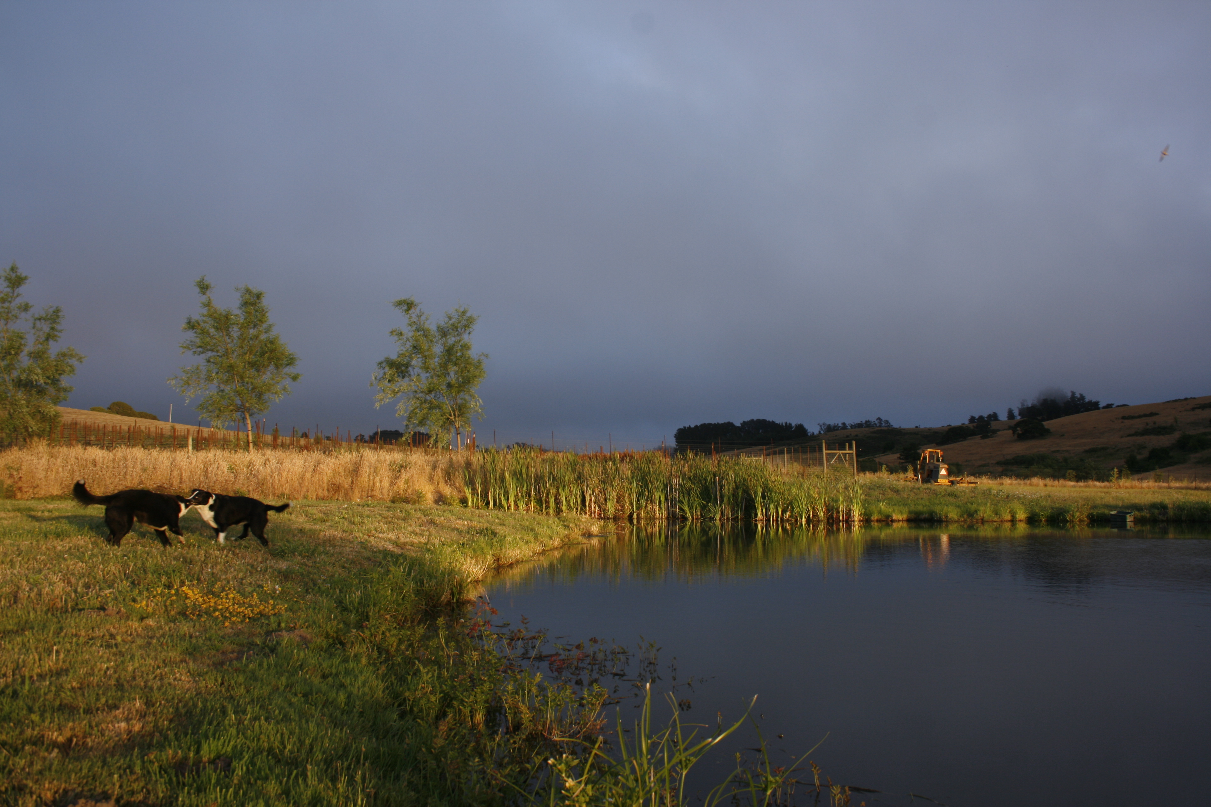 Pax and Troubles, fighting over a stick by one of the ponds.