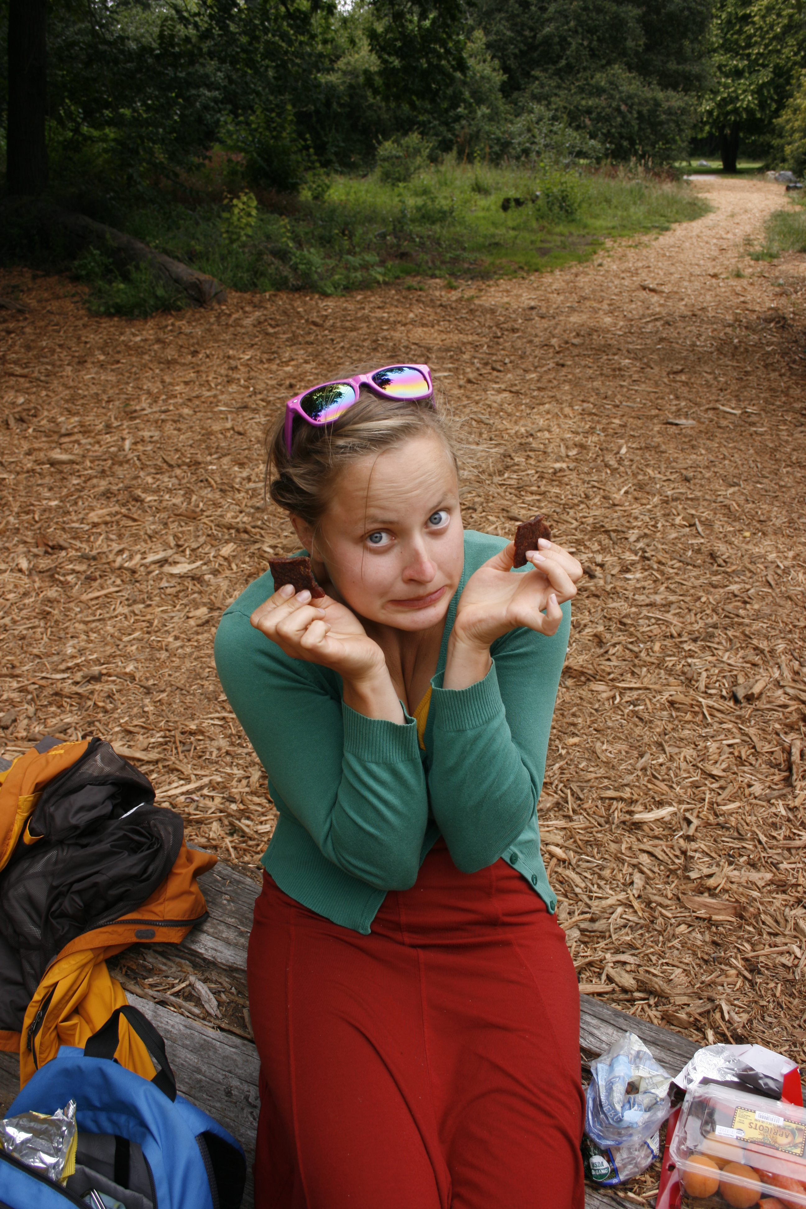 After that, Sarah, Derek and me stayed in the park for a while and had to force a thicket before finding the perfect pic nic spot. Here, you see me trying beef jerky for the first time in my life. Really, despite the way I look on the picture (you know I love making faces), it wasn’t that bad. It was kind of like the biltong of South Africa. Perfect for a warm day on the road … but maybe not really good for anything else.