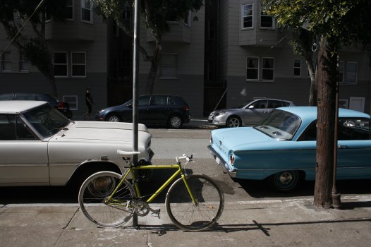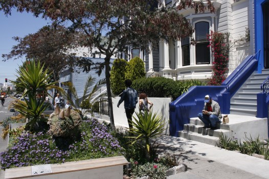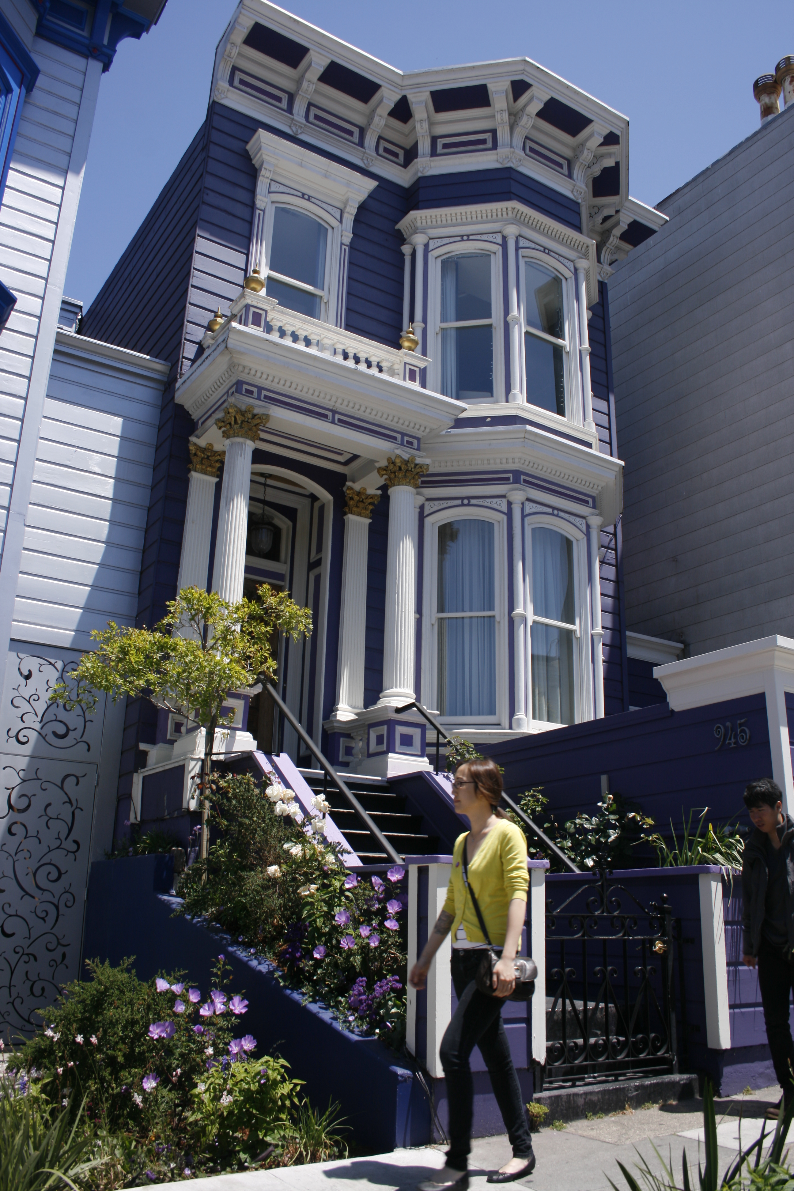 The dinosaur to the left is part of a parking lot park – a thing they have in San Francisco. The owner of the beautiful blue townhouse had chosen to remake the parking lot in front of the building into a tiny park. Just one of those wonderful, inspiring things you come across in San Francisco. More parks and less cars!
