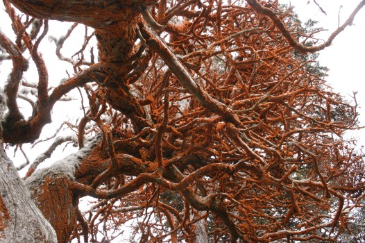 Some of the trees were covered in these bright red orange lichens. It looked queer and mysterious.
