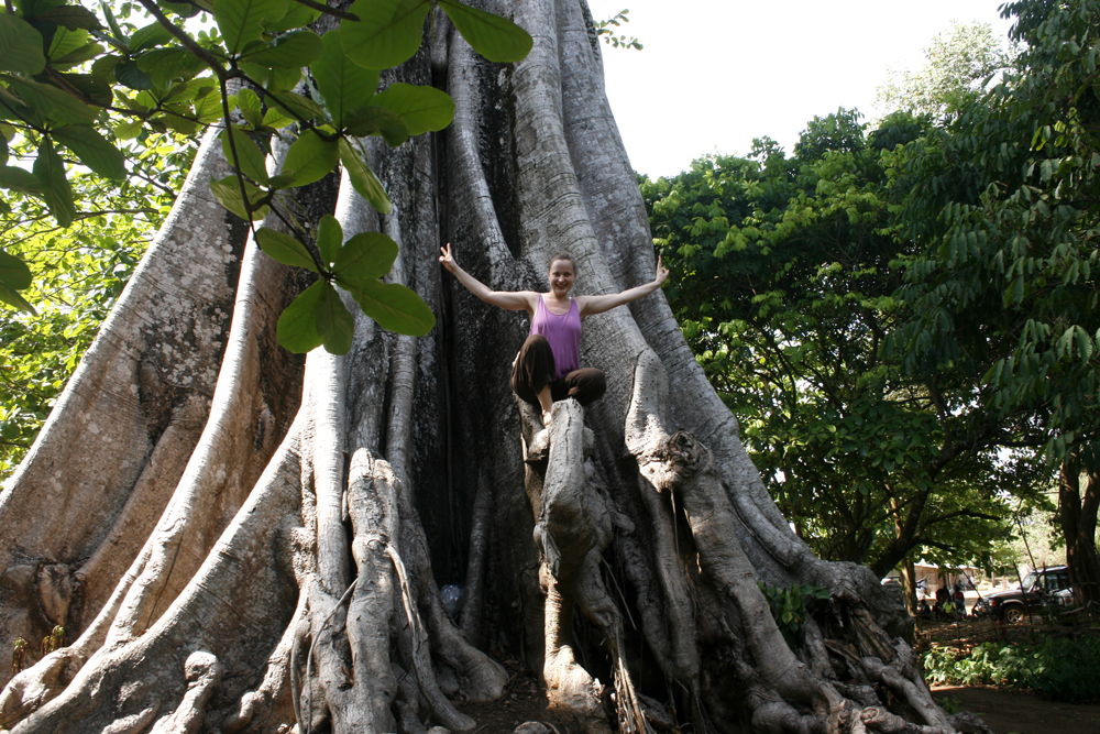 You know, few things compare to rain forest trees. This grew more or less on the beach, where they just had opened a small camp ground at the Robertsport beach. It was covered with thorns and I was wearing flip-flops, but hey, I’m not made of glass. I’m made of skin and by the time I got down on the ground again, my feet, legs, hands and arms were covered with blood drops and tiny puncture wounds. I’m nothing if not devoted to trees, and the posing in different ways with them.