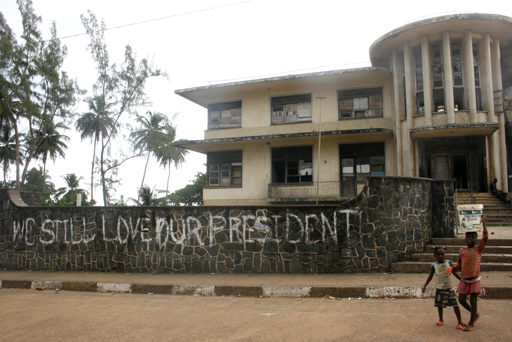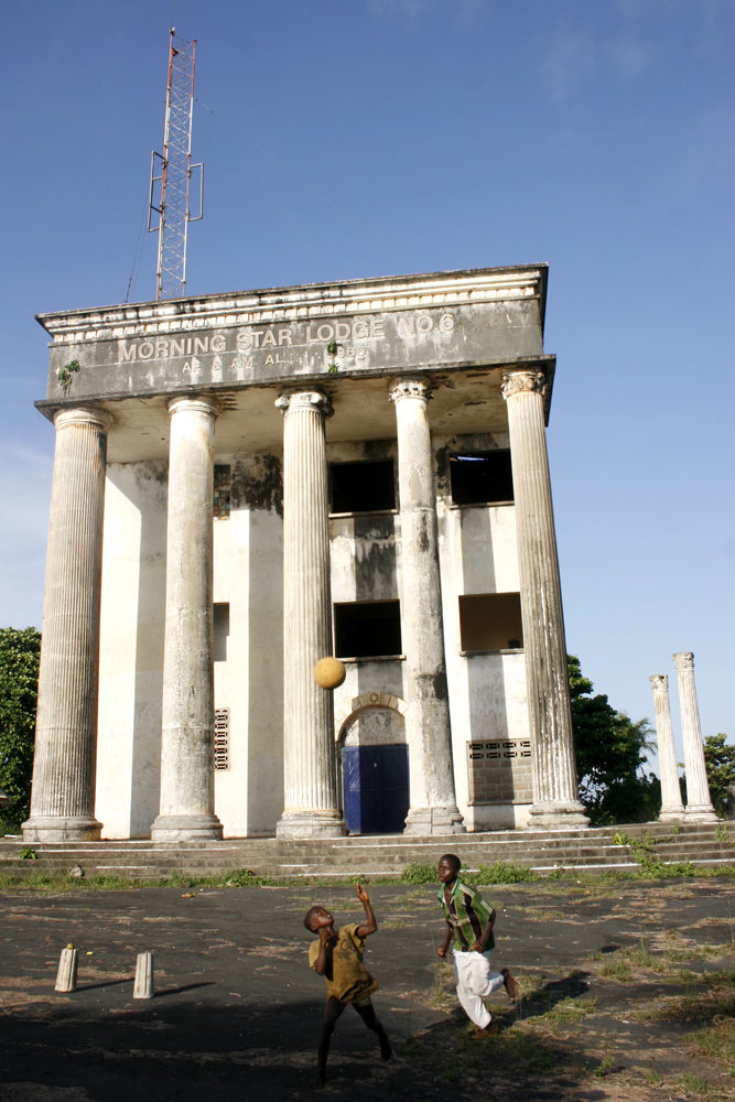 Most Liberians are, for some reason, FC Barcelona fans. However, just outside of this shot is a boy in a Ibrahimovic shirt. Morris played some ball with them, while Hanna and I took photos of the odd architectural specimen behind them, nowadays used as a place for public meetings.