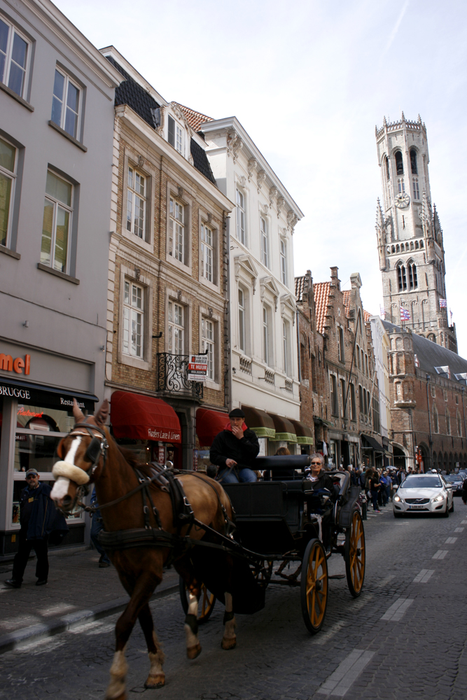 The draught horses have found a new calling in Bruges: to carry the tourists around town.