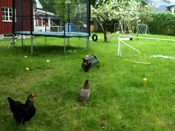On my way to my last tutoring session before summer, I happened to see something surprising in the back yard of a neighbor to the family I tutor for. The neighbors did not only have the obligatory trampoline and other toys spread around the garden, they also had a bunch of hens. Seriously, egg laying hens!