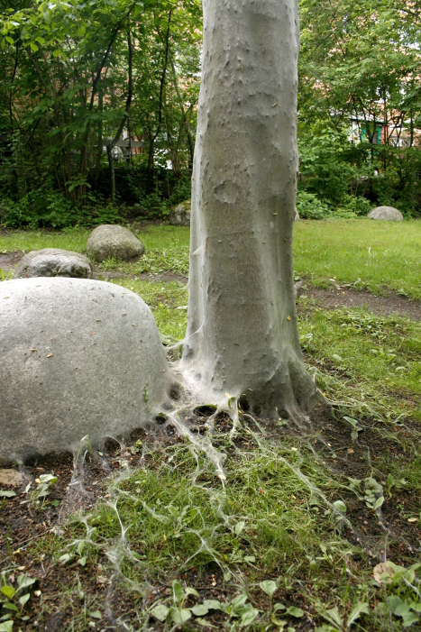 There is a moth larva that is eating up all the flowers and the leaves of the bird-cherry trees in Stockholm. They cover the trunks in a greyish all-covering net that spreads out on the ground.