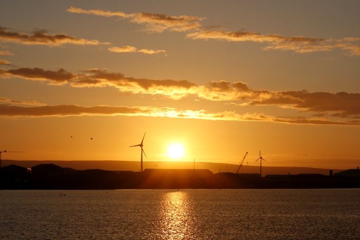 The sun going down, seen from the Kirkwall harbour. The wind turbines creating a hopeful skyline – at least for me.
