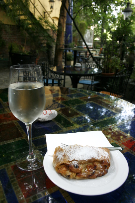I didn’t feel like going to another art exhibition after Belvedere, so instead I went to the Kunsthaus café, where every table looked different and the trees offered a wonderful coolness. I ordered an apfelstrudel and a spritzer, because the guide book had said that those were typical Viennese things to order in a café. And they were good, I guess. Even though I don’t really see the point with mixing white wine with sparkling water, when you could drink them separately and get so much more taste out of it.