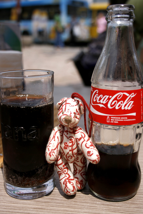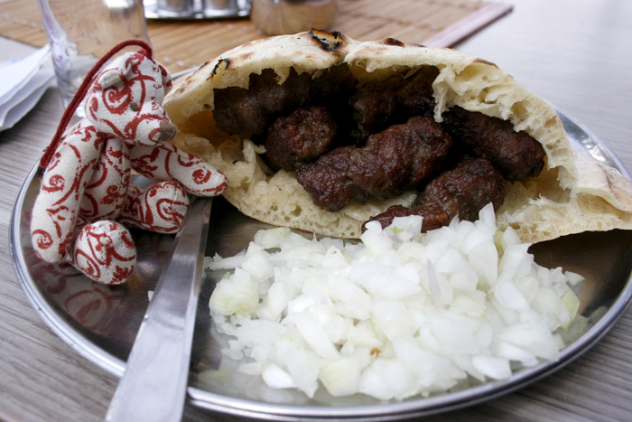 When the food came, it was in the shape of meatball-like things with raw onions in a pitabread. And the kajmak resembled cottage cheese, but was a lot saltier. And really really good. Mr. P agreed. This was not the last time we had cévapcici.