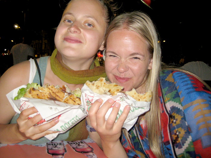 And our first night together in Belgrade was spent looking for dinner, finally buying some tasty Serbian fastfood. Meat in bread with hot sauce, salad and onions. Anything can taste great, as long as you’re eating it with your friends.