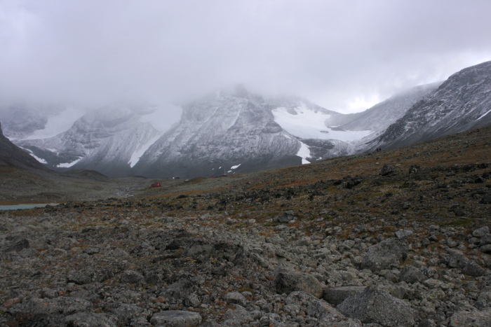 When we woke up this morning, the mountainsides had white contours. It had been snowing, and just about when breakfast was over and it was time for us to go out into the field again, it started again. I spent hours walking around on the wet and slippery moraine, looking for the biggest lichen, trying to compensate for the sudden wind bursts of tiny, wet snowflakes. It felt like being in the middle of a freezing cold desert sand storm with large grains of sand filling the air.