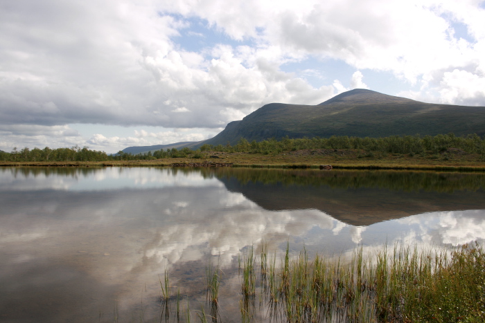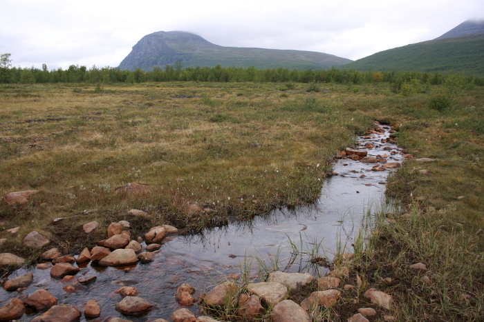 At nine on Friday morning, we left Nikkaluokta. The first stretch of the trail went through pretty flat terrain in a dense but low birch forest in Laddju valley. There were blueberries growing everywhere. Occasionally, the trees gave way to rivers, lakes and small wetlands.