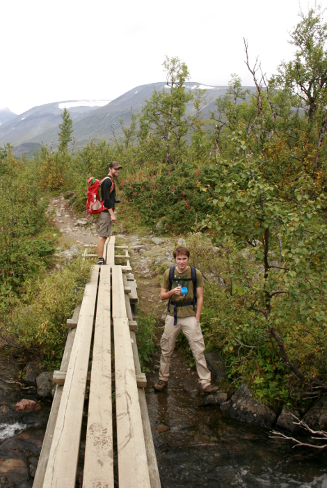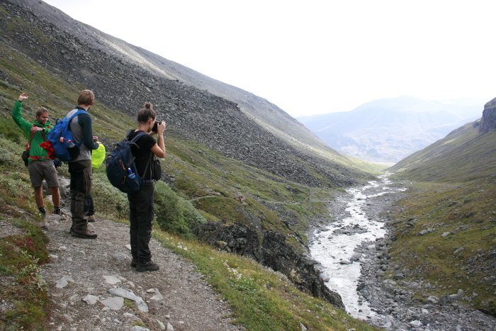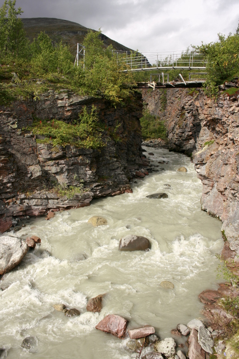 The bridge crossing the small canyon in the Tarfala river, where we ate our lunch. This is where we left the comfortably wide, glacier eroded valley we had been walking in for five hours, and started heading up following the Tarfala river into the Tarfala valley.
