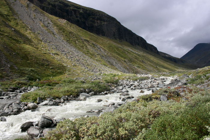 The Tarfala valley, not U-shaped, glacier eroded like the previous one, but a V-shaped river valley. Not completely logical, since the latest ice age ice sheet covered this valley as well as the previous one – maybe the ice was frozen to the bottom here, preserving the old landforms. One of the geomorphological mysteries. Up here, the trees couldn’t grow anymore – but the occasional blueberry could still be seen in the shelter between the blocks. Mostly, though, the vegetation consisted of mosses, lichen and small flowers.