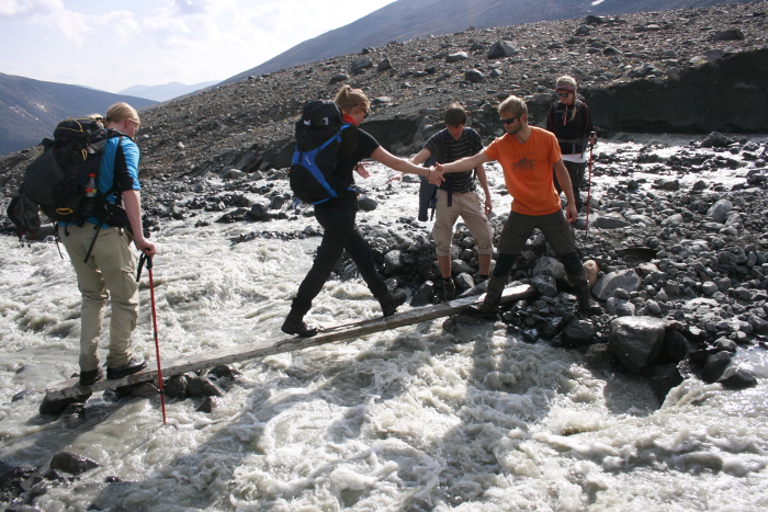 Crossing the Storglaciären meltwater jokk was no easy task. We had to build our own temporary bridge with rocks and an old plank. Johan, always the gentleman, stood on the other side of the very unstable bridge, making sure everyone got over safely.
