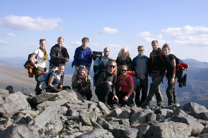 At the top of the ridge, everyone gathered to look at the view. Perfect spot for a group photo, using the self-timer. So, there we are, all of us, top row from the left: me, Daniel, Christoffer, Erik, Elin, Johan, Robert and Kajsa. Kneeling: Sandra, Gisela, Sara and Emilie. Great group. Really great group.