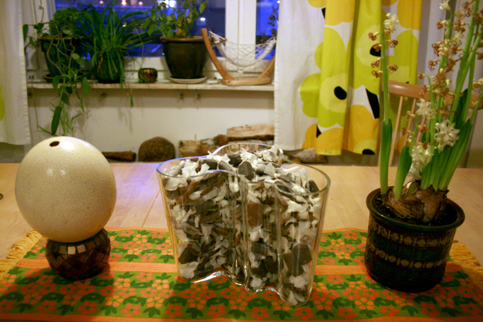 I’ve even had time to do some weird table arrangements: an ostrich egg I found while cleaning in grandpa’s house, some of the Christmas toffees that I’ve cooked, cut and wrapped, and Lina’s hyacinth, on top of a table cloth that I also found at grandpa’s.