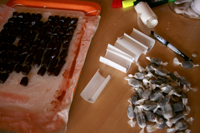 Wrapping can be a nightmare. I’ve decided to hand-write the flavor of the toffee on every paper, to give the toffees a personal touch (I’m such a STUBBORN IDIOT), and that takes forever.