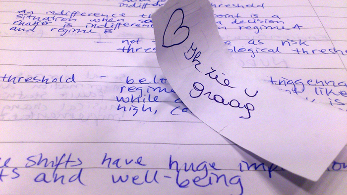 They’ve all been left by a classmate. I strongly suspect Jessica (because it’s her hand writing, and one of them was in Flemish), but the computer post-it could be Hannah.