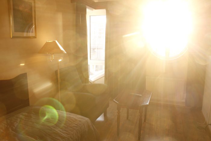 I have a cute little corner room with evening sun. It’s already past eleven, and the sun is still shining as if the end of the day was still hours away. Luckily, the curtains are surprisingly thick – or maybe not that surprising, after all. It’s a hotel. They must get many light-sensitive guests here this time of year. There is heating in the floor in the tiny bathroom. Actually, this room is very well adapted to its location.