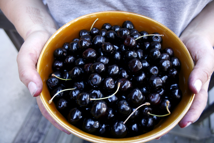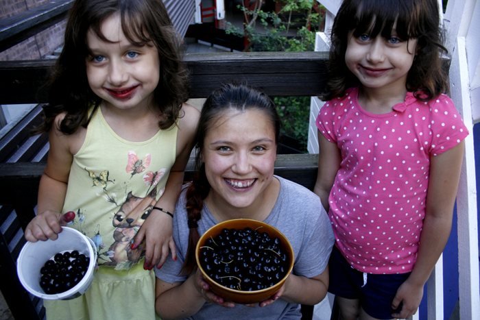 On the way home, I started telling Natalia about the cherries that are going to waste by my house, and one thing lead to another and suddenly we were both standing on the roof of a bicycle shed, picking big, black cherries into old yogurt buckets. The six-year-old twins that live in my building helped us by running around on the ground, yelling instructions to us about where the biggest cherries were. Deep purple cherry juice all over their faces.