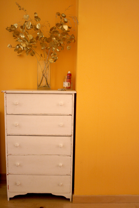 The little chest of drawers that I saved  when I was helping dad to clear grandpa’s house in November. And the dried and gilded branches that were part of aunt Kaarina’s birthday bouquet to mom for mom’s 60th in December, that I saved from the rotting tulips and ferns. They’ve been in a vase in that forgotten corner next to the bathroom ever since. I chose the warm yellow color in the hallway when uncle Kalle tore down the kitchen wall years ago.