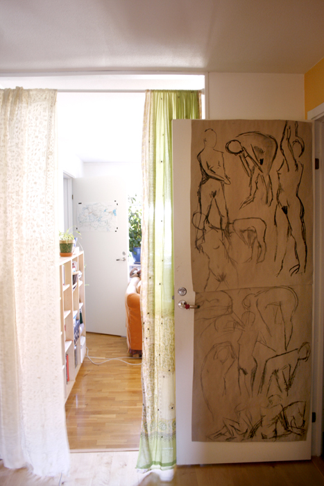 My attempts at croquis covering the bathroom door, the broken balloon rubber still tied to the door handle since October, when Hannes put it there.