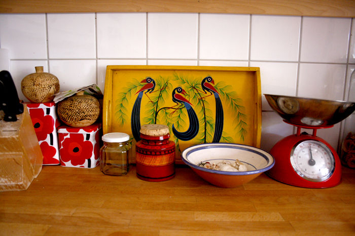 Stuff on the kitchen counter. The Tinga Tinga tray that dad bought in Tanzania and gave to grandpa, and I then saved when the house was cleared in November. The bowl that I bought for mom when dad and I were on Sifnos in Greece, in, what, 2001? The mechanic scale that I bought when I had just moved to Uppsala, and that I used to weigh all the apples that I stole from the villa gardens at night.
