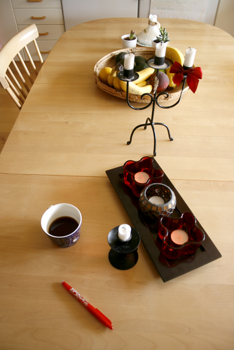 Mom’s morning coffee left on the kitchen table. The single candlestick that Hanna gave me for Christmas sometime in our teens. The ribbon, that originally was attached to a bottle of wine that Vivi brought for one of all the dinner parties that I’ve hosted during the past year. Lina’s penis cactus at the far end.