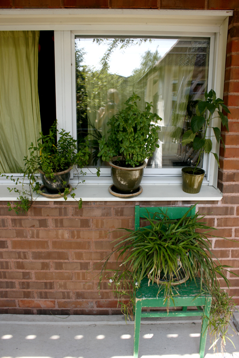My bedroom window, as seen from the outside. My mint and my basil, Lina’s chili and the spider plant that I’ve been trying to kill for more than a year.