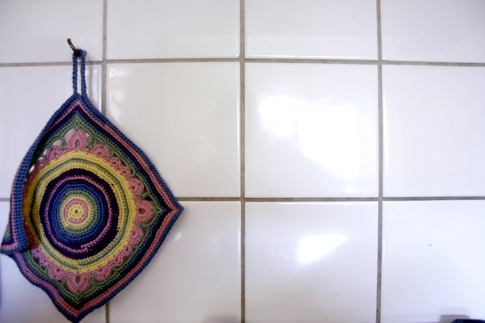 Above the stove. Before Christmas, I crocheted so many potholders while learning about regime shifts and resilience assessments in class.