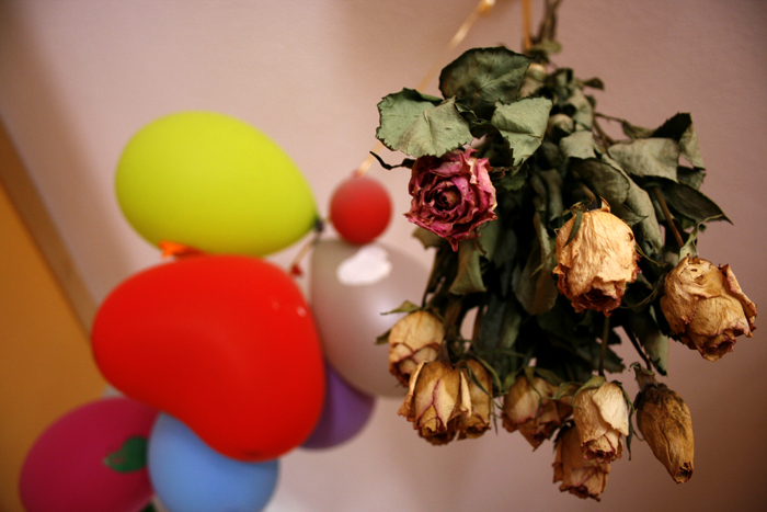 Hanging from a hook in the hallway ceiling. The dried roses a birthday gift from Kirke, I can’t even remember how many years ago now. I don’t like getting flowers. I can’t justify the long transportation required to get them here, when their only function is to look pretty. However, Kirke often buys me flowers anyway. The balloons are still left from the party in October. I’m planning an October party volume two, to celebrate the balloons’ one-year-anniversary. Also, I’m leaving for West Africa in October, so I guess it’ll be a goodbye party as well. Possibly Christmas-themed. I’m already looking forward to doing all the Christmas baking in October.