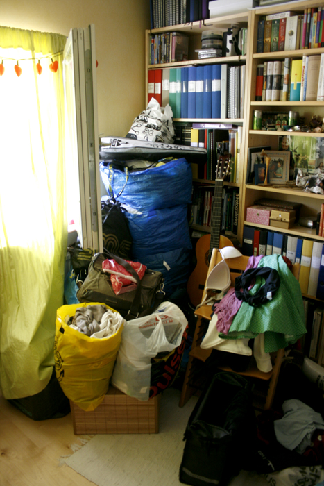 My bookshelves, this summer almost completely hidden behind Jessica’s stuff that I allowed her to store here. On Monday, Dries will come to drop off his stuff here too. I’ve become a regular storage facility for Belgian students in Stockholm.