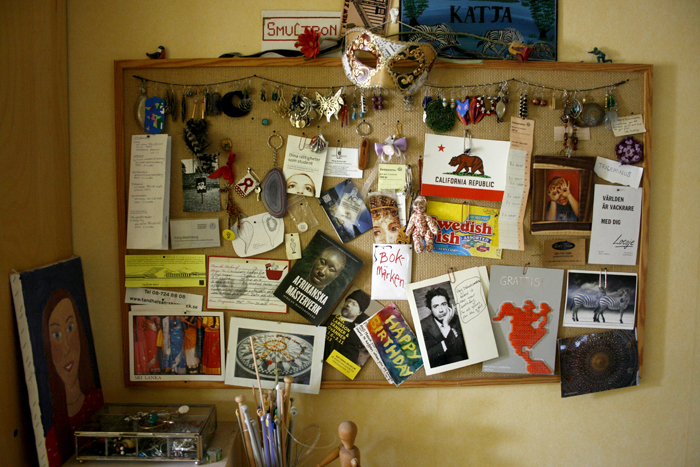 My bulletin board, full of mementos from all over the world. Mr. P. The mask I bought in Venice when I was there with dad and Hanna in 2003. The front of the box of Swedish Fish that I bought when I went to that Slovakian movie at the Seattle Film Festival together with Miles and his girlfriend. The brochure for the Carl Larsson exhibition that I went to last fall as the second date with the guy who later that evening grabbed my ass and ever since is known as the ass-grabber among my friends. I did not go on a third date with him – not really because of the ass-grabbing, but. School just forced me to drop everything that wasn’t essential. The note where I wrote down the name of the nerve that refuses to agree with me sometimes, paralyzing half of my face: trigeminus. The medical student that I was seeing in the fall of 2008 looked it up for me. He didn’t stick around to teach me the names of any more nerves, but I kept the note. It’s already happened three times, complete face paralysis, statistically I would say that the risk of me getting the face paralysis again is significant. I might just as well know the correct name of my tormentor.
