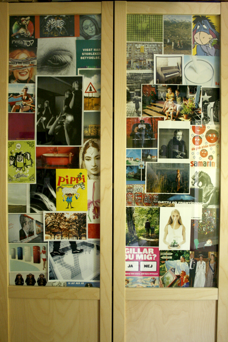 The doors of my cabinet. During a period in my teens, I spent a lot of time in cafés, and there I developed an interest in collecting free postcards, the kind that actually are advertisements. This is where some of them ended up, together with some old photos of friends and family as well as some of the analogue photos that I took and developed in the lab in photo class the last year of high school.