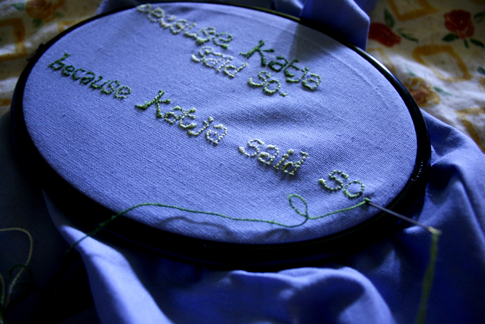 And now I’m all excited about embroidering. I’m overflowing with ideas – pillowcases and cloth bags and aprons and purses. I have tens of meters of Liberian fabrics. No one I know will be safe! (Of course, I won’t write because Katja said so on everything. That would be a little bit too self-indulgent, I think, even for me. It’s just a thing, an insider joke between me and Jessica. – – Also, I’m counting on that she doesn’t read this. I want this housewife touch to her gift to be a surprise. She’s been in Belgium all summer, and no one from Belgium has visited this page, according to the statistics that WordPress so generously provides me with. So. I think I haven’t made a huge blunder by publishing this.)