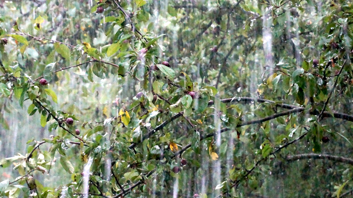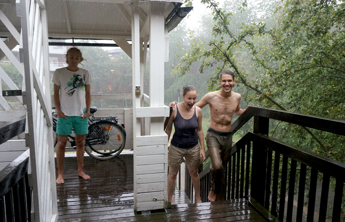 Hannes, who was visiting, isn’t a crazy Ruohomäki family member and didn’t therefore follow us out into the storm, but he stood in the gazebo and laughed. Mom brought out the camera. We must have looked like two escaped mental patients. An amusing sight, indeed.