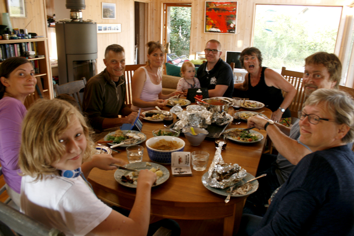 Aunt Eva and dad came with two huge zucchinis and the fish – beautiful, freshly caught mackerel. Kai and Tilda invited their mothers and me to fika.