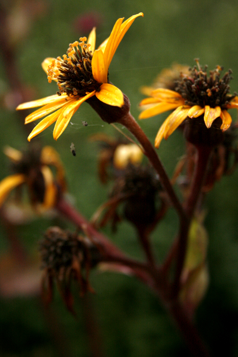 In the garden, the fall flowers are still blooming.