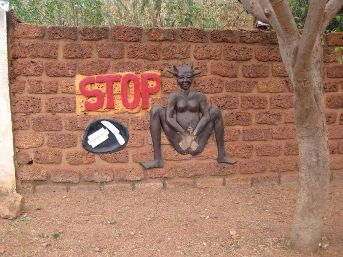 The hotel/guest house has some kind of research twist to it, and on the wall around the compound, different kinds of edifying messages have been painted. This slightly vandalized one wants to stop female circumcision.