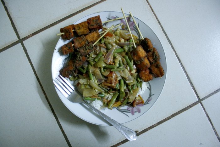Vegetable stew on onions, pepper, garlic, tomatoes, cabbage, green peas and groundnut paste with rice, and deep fried tofu brochettes that we’ve started buying from a girl who sells them in the street.