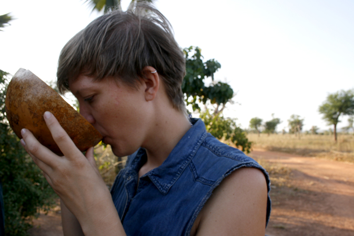 I don’t only want to do sight-seeing when I’m a tourist. I also want to try the local foods and drinks. The traditional drink in southern Burkina Faso is called bandji. It’s a kind of palm wine, made by tapping sap from a certain kind of palm tree. And that’s it. The sap gets tapped in the morning, and if you drink it then, it’ll be a slightly sweet drink with an aftertaste of coconut. And if you let the liquid sit for a day or two, it starts fermenting and becomes slightly alcoholic.