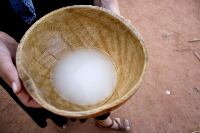 So, on the way back to town from the waterfalls, we stopped in a village and had some of the fermented stuff, shared in a calabash bowl. It, also, tasted slightly sweet, but the fermented taste was quite dominant, and for some reason I thought there was an aftertaste of bacon. I wouldn’t say it was disgusting, but it wasn’t a drink I would choose if there was something else on the menu too.