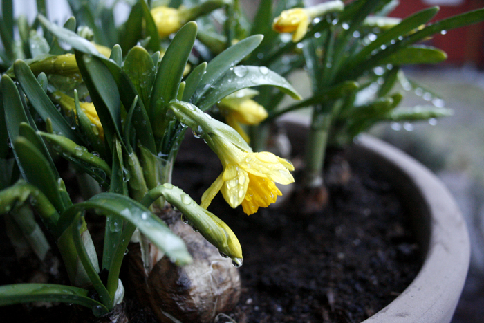 Driving out to the cottage through the March rain, Dries in the passenger seat feeling carsick. There were cranes on a newly turned field. Spring is here, gray and beautiful.