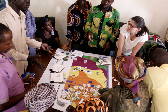 Each player got a set of pins and tokens, depending on the size of their families (for farmers) or their political, social or economic capital (for the other participants). During the rounds, these could be used to buy seed, animals (for farmers) or an intervention (for the other participants). They were then placed somewhere on the board in accordance with where they would do these activities in real life. After every round, the game facilitator (in the picture above, Kate) gave new tokens to the farmer participants based on where they had placed their activities. The number of tokens were then compared with the size of each family, to see if it was enough to feed them.
